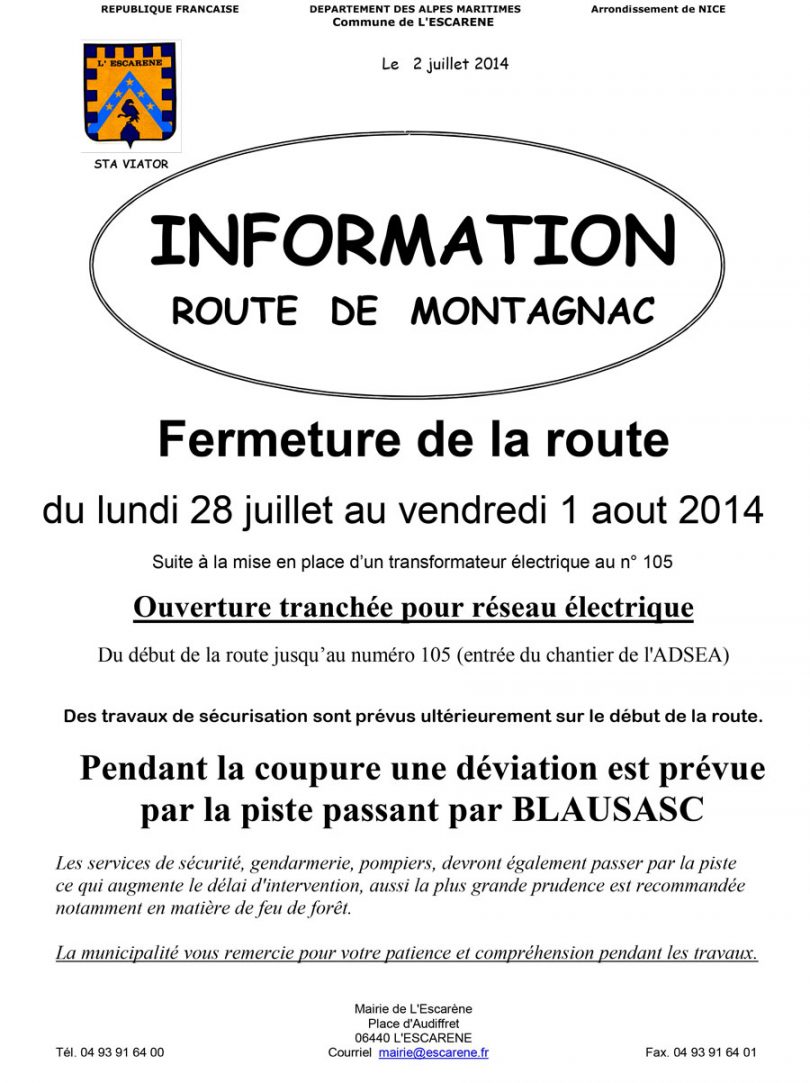 Fermeture route de Montagnac – 28 juillet/ 1er août 2014