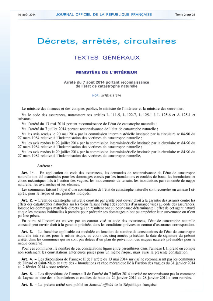 Avis de catastrophe naturelle – Arrêté du 07 août 2014