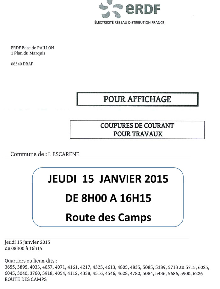 Coupures de courant pour travaux / Route des Camps – 15 janvier 2015