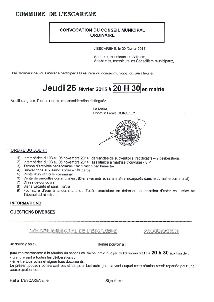 Convocation au conseil municipal ordinaire du jeudi 26 février 2015