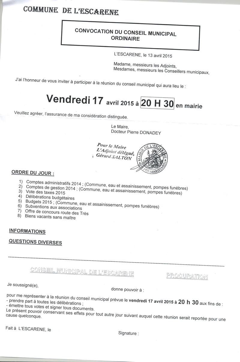 Convocation au conseil municipal ordinaire du vendredi 17 avril 2015