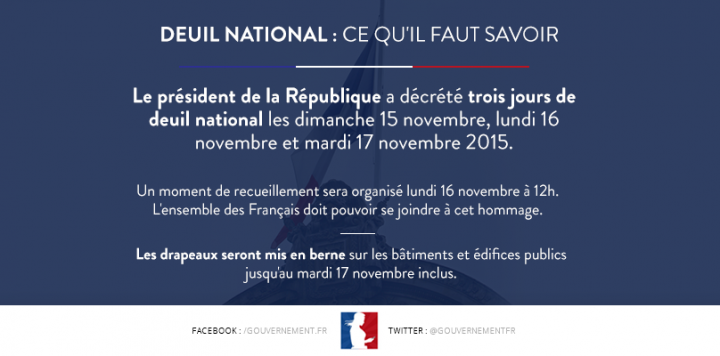 Conformément à un décret du président de la République, les dimanche 15 novembre, lundi 16 novembre et mardi 17 novembre 2015 seront jours de deuil national afin de rendre hommage aux victimes des attentats commis à Paris le 13 novembre 2015.
