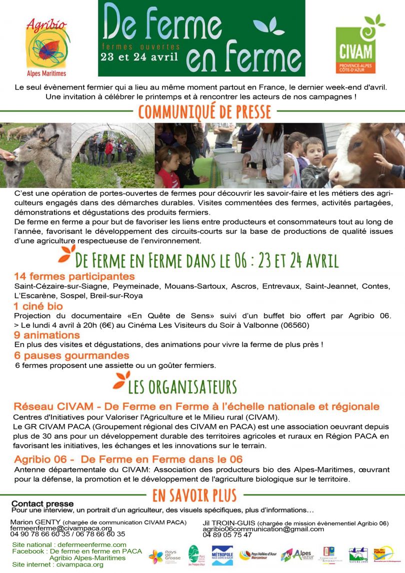 L’ASSOCIATION DES AGRICULTEURS BIO DES ALPES-⁠MARITIMES organise la 2ème édition de l’évènement DE FERME EN FERME le week-⁠end du 23 ET 24 AVRIL DANS LES ALPES-⁠MARITIMES.