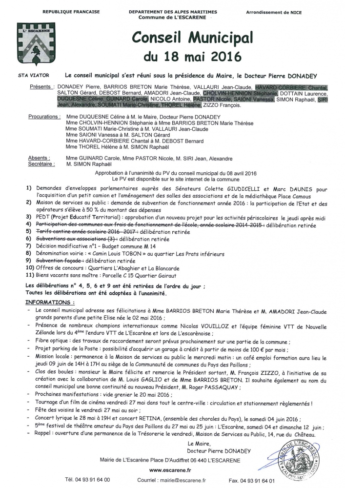 résumé du conseil municipal du mercredi 18 mai 2016