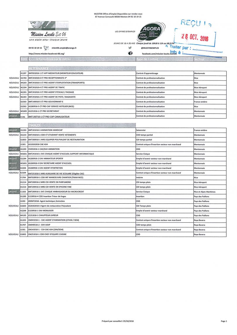 EMPLOIS JEUNES// MISSION LOCALE – FIN OCTOBRE 2016