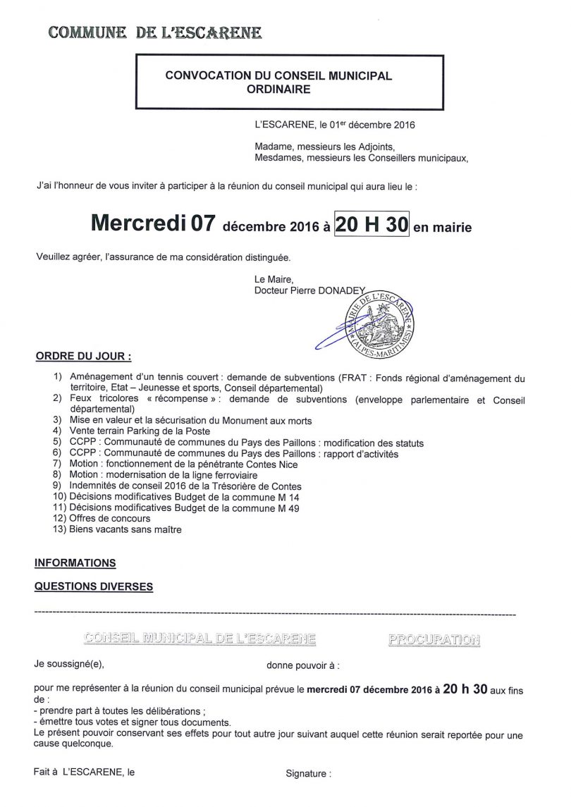 Convocation au conseil municipal ordinaire du mercredi 7 décembre 2016