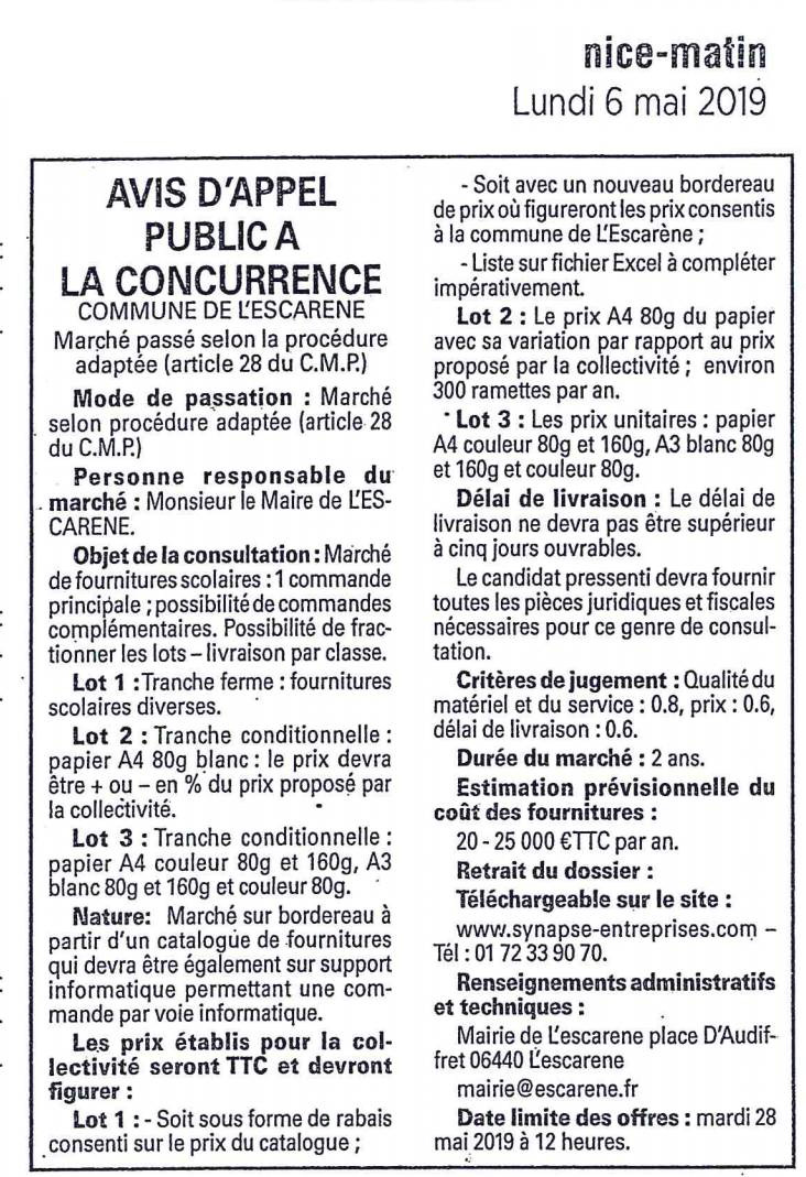 Avis d’appel d’offres 2019 – Fournitures scolaires