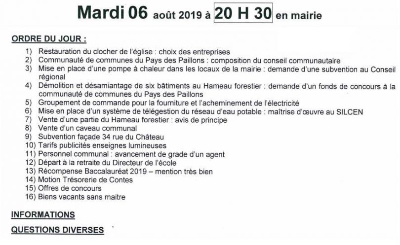 Conseil Municipal du mardi 6 août 2019 – 20h30 – Salle du Conseil
