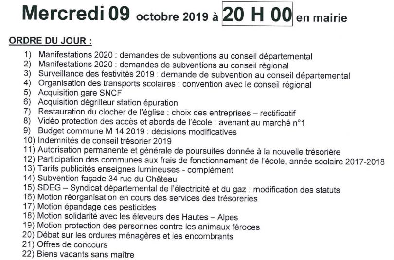 Ordre du jour du Conseil Municipal du mercredi 09 octobre 2019 à 20h00