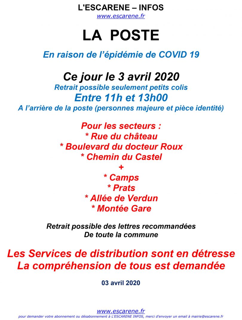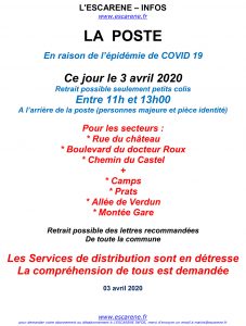 LA POSTE En raison de l’épidémie de COVID 19 – Ce jour le 3 avril 2020