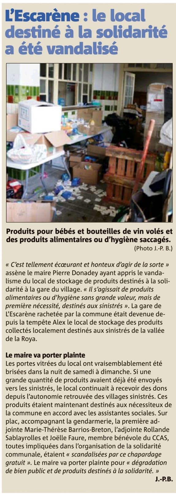 L’Escarène : le local destiné à la solidarité a été vandalisé !