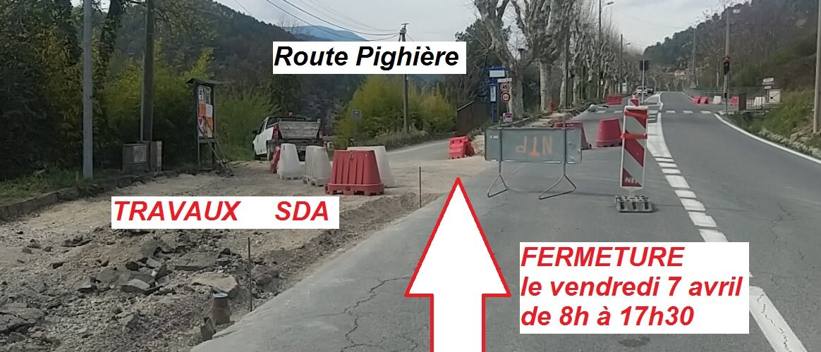Fermeture début route Pighière le vendredi 7 avril 2023. Travaux routiers SDA. Déviation par le côté école-cimetière.