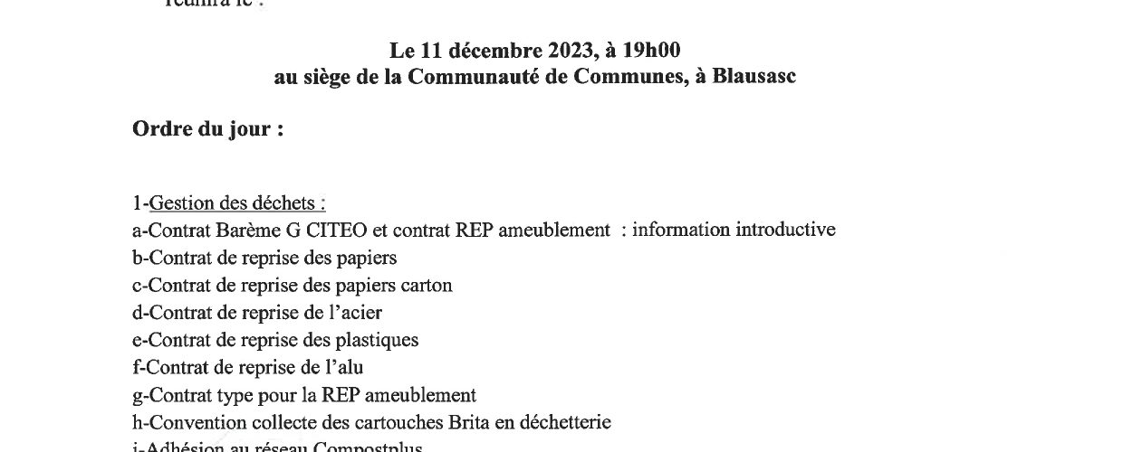 Ordre du jour Conseil Communautaire le 11/12/2023 à 19h