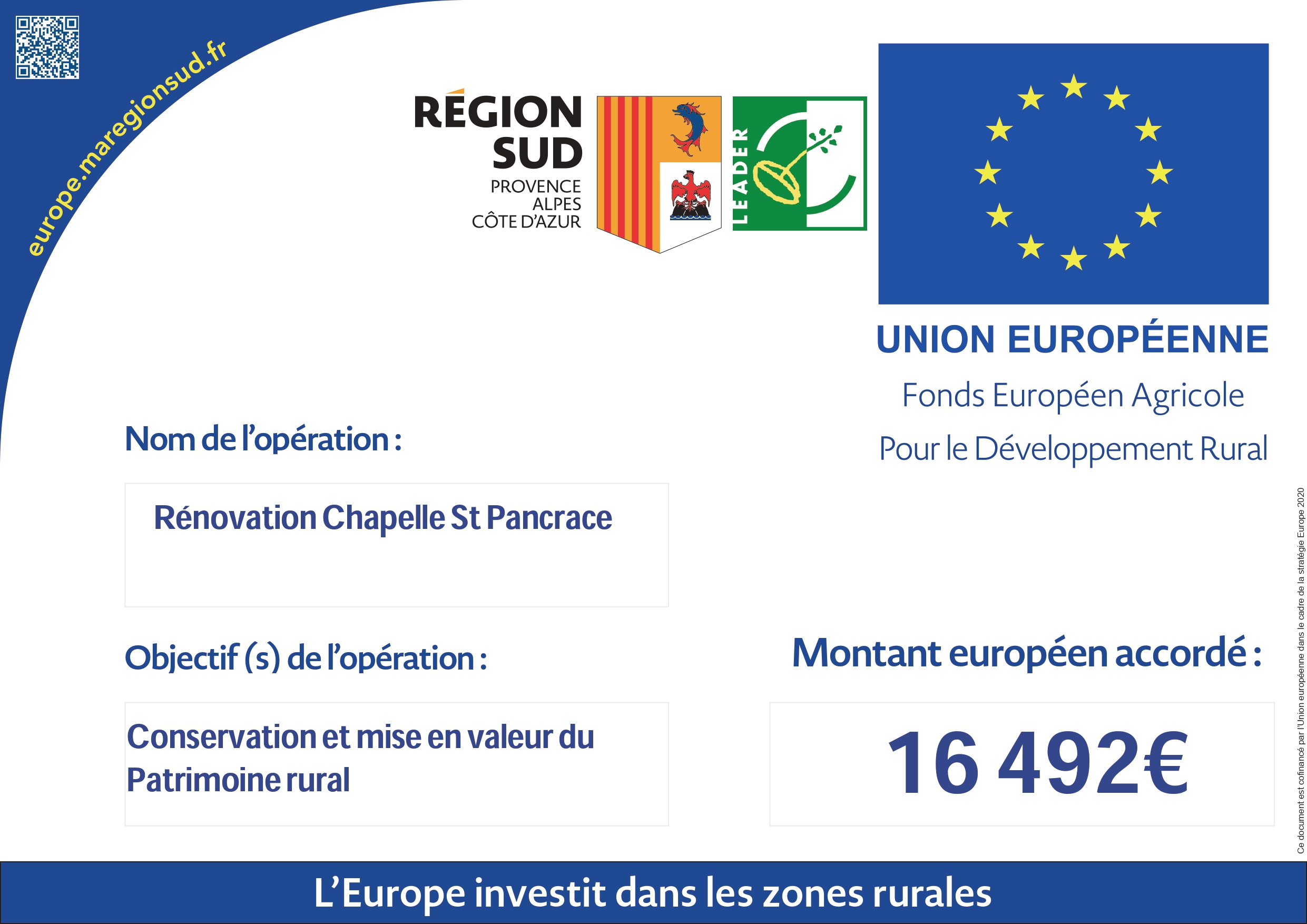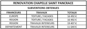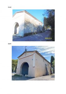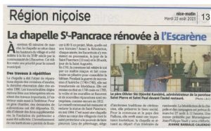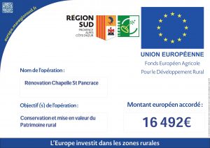 « Grâce au soutien de l’Europe, du Conseil régional et du Conseil départemental, la commune de l’Escarène a pu conduire en 2023 sur la chapelle Saint Pancrace des travaux de ravalement des façades, de rénovation de la toiture et de rénovation intérieur (enduits intérieur)
