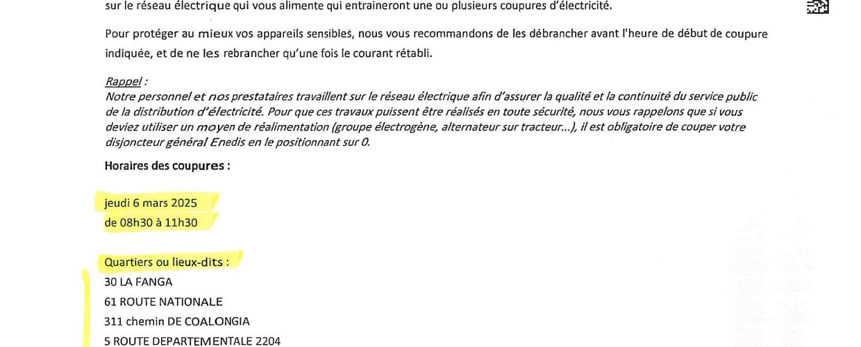 ENEDIS COMMUNIQUE : COUPURE ELECTRICITE – 6 MARS 2025