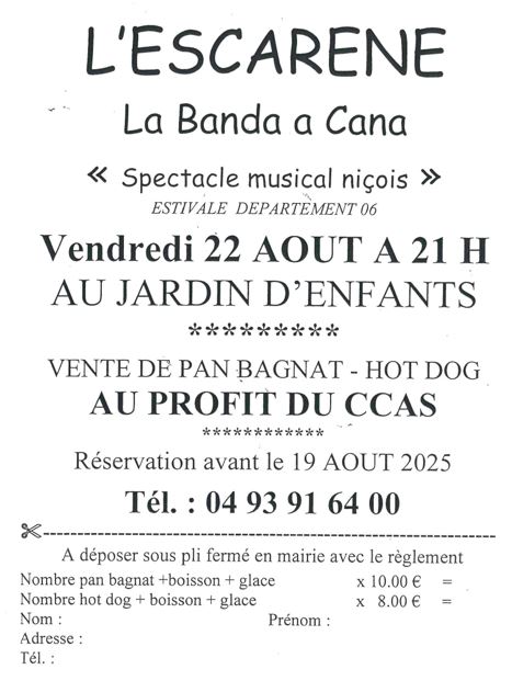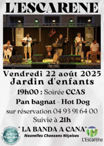 Vendredi 22 août 2025 – Jardin d’enfants – 19h soirée Pan bagnat au profit du CCAS – 21h – Estivale 06 « La Banda a Cana »