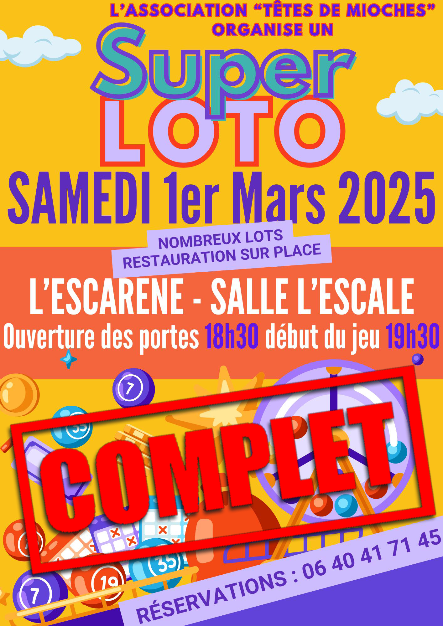 Grand loto de l’association « Têtes de Mioches » – Samedi 1er mars 2025 – Salle L’Escale – 18h
