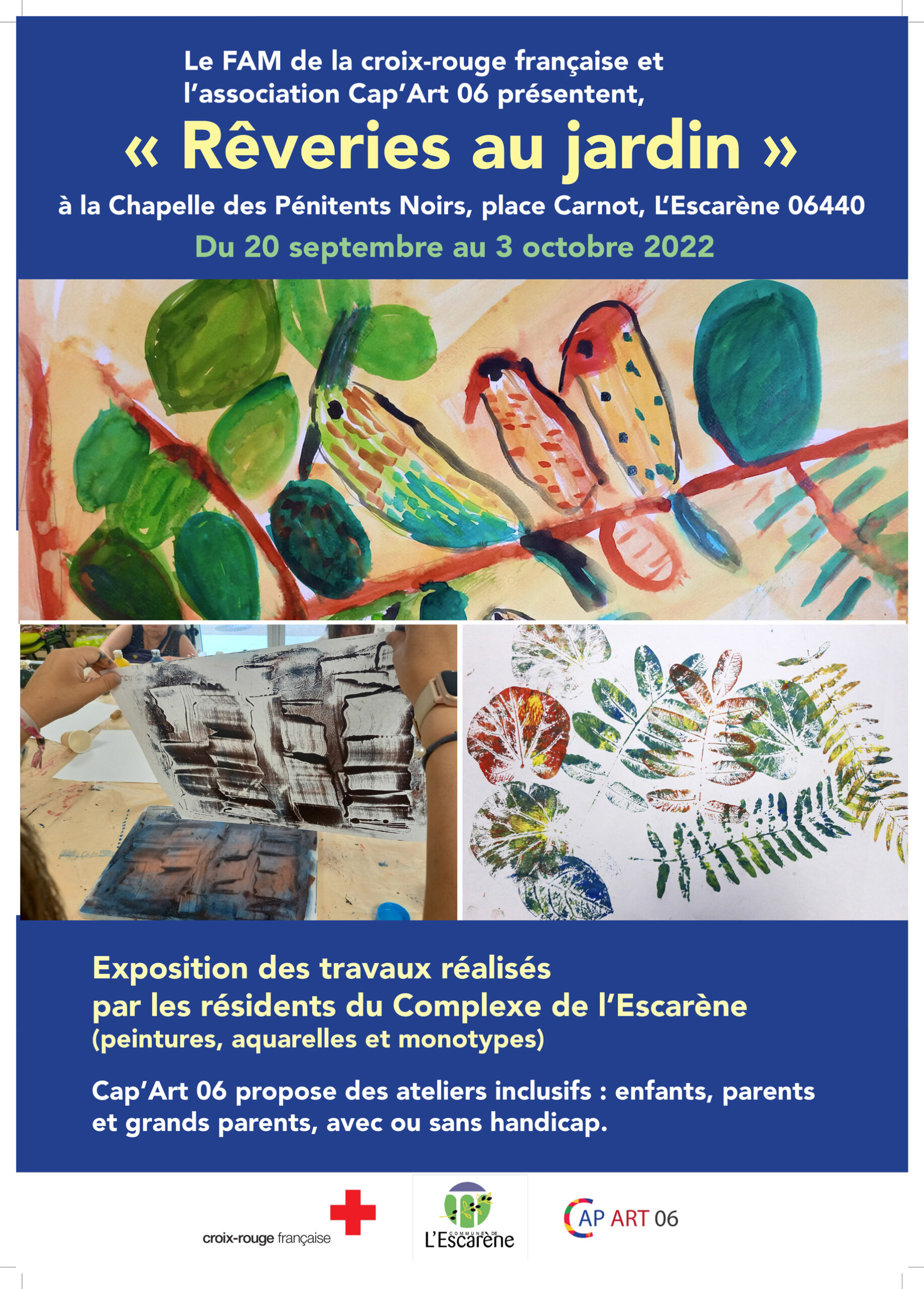 Le FAM de la croix-rouge française et l’association Cap’Art 06 présentent, « Rêveries au jardin » à la Chapelle des Pénitents Noirs, Place Carnot, L’Escarène 06440 – 20 septembre au 3 octobre 2022